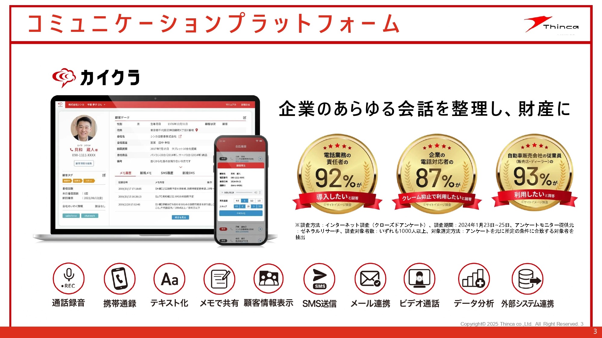 『カイクラ』のコンセプトは、“会話を クラウドで おもしろくしよう” ビジネスにおいて、お客さまと多くのコミュニケーションがあるからこそ、“言った言わない”などの会話トラブルが発生しています。それにより無駄な時間を費やすだけでなく、ストレスや、関係悪化につながります。 それではもったいない。会話はもっとおもしろいはず。 会話を楽しめれば、もっと人間関係も深くなる。人間関係が良好であれば、もっと人生が幸せになる。そのような想いのもと、『カイクラ』は「コミュニケーションプラットフォーム」として生まれ変わりました。