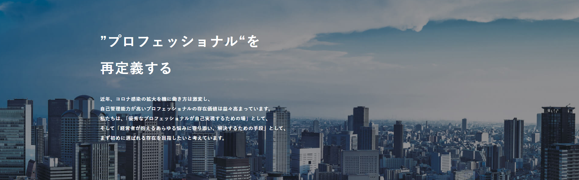 働き方に対する価値観が変わり、コロナ感染拡大により働き方も激変、自己管理能力が高いプロフェッショナルの存在価値は益々高まっています。 そのような中、市場の成長に伴いプロフェッショナリズムも変わりつつあります。 「顧客の期待を超える価値を提供し続けたい」「プロフェッショナルとしての働き方やキャリアを選択できる柔軟性を残したい」 「優秀なプロフェッショナルが自己実現するための場」「経営者が抱えるあらゆる悩みに寄り添い、解決するための手段」としてまずはじめに選ばれる存在となることを目指します。 “プロフェッショナルを再定義する”これが、私たちが実現したいミッションです。