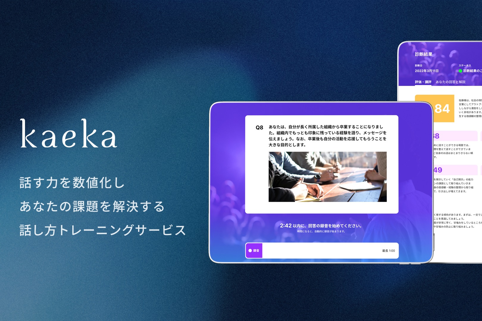 「『話し方教育』を全国に広げ、誰もが言葉を磨く社会をつくる」をビジョンに掲げ、話し方トレーニングサービス「kaeka」(旧:GOOD SPEAK)を主軸に、経営者、政治家、社会人に向けて話し方トレーニングを提供しています。また、企業の総会や新作発表会、国政選挙などでスピーチ原稿の執筆に取り組んでいます。 【主要サービス】 ・話す力を数値化しあなたの課題を解決する話し方トレーニングサービス「kaeka」 ・完全プライベートの話し方トレーニングサービス「kaeka pro」 ・話す力を数値化し強みと課題を見つける「kaeka score」 ・スピーチ原稿のライティング